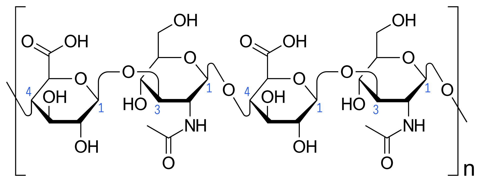 L’acido ialuronico presenta una struttura polimerica lineare formata da acido glucuronico e N-acetil glucosammina, ripetuta migliaia di volte. Questa conformazione idrofila trattiene l’acqua e mantiene l’elasticità della pelle.